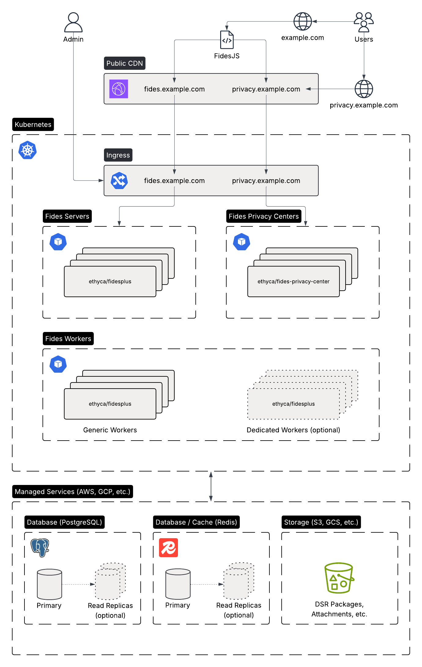 The Fides platform is released as Docker images designed to be deployed as services to any modern container orchestration platform. This guide provides an overview of the Fides architecture, its components, and external dependencies for production deployments.